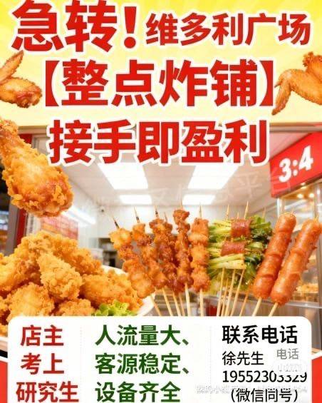 急转!维多利广场黄金旺铺【整点炸串】接手即盈利 因个人家庭事务急需处理,忍痛低价转让经营中炸串店!店铺位于维多利广场核心商圈,人流量密集、消费需求旺盛,周边配套成熟,自带稳定客源。 目前店铺设备齐全、证照齐全,经营状态良好,接手无需额外投入,直接可正常营业,省去装修、筹备等繁琐流程! 诚意转让,价格可议,欢迎实地考察!